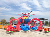 在充满欢声笑语的室外游乐场当中,一座直径14米的彩色“章鱼”正在旋转,5条机械触手托着30名游客在空中划出波浪形轨迹,伴随着动感的音乐和绚丽的灯光