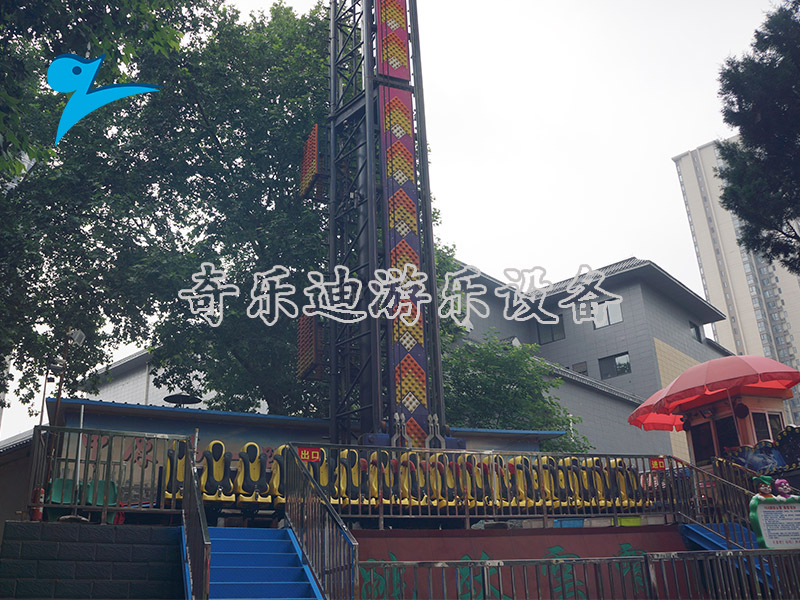 跳楼机是一款在游乐园和主题乐园当中常见的游乐设备,它的整个外型主干设计为一个高大的立柱,在柱体的周围附有轨道,从而完成座舱的上升与下降。站在地面上看它直入云霄,在蓝天白云的背景衬托下让人望而生畏,炫丽的多彩灯光设计在夜晚当中绽放出无限的魅力,它在游乐园当中就像一个醒目的标志吸引不少游客的争相体验。惊险刺激的乘坐体验等待你的亲自到来。