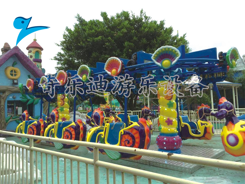 游乐设备,它选用大海蓝色作为整套设备的主色调,外部搭配有贝壳、海星、珊瑚等动植物造型装饰,新颖卡通的外观造型直接吸引了不少游客的驻足。为给游客营造更好的乘坐效果,我们在顶棚与座舱设计上增加了五彩缤纷的霓虹灯,在夜晚灯光的映衬之下,游客仿佛置身神秘的海洋世界相互追逐滑行。
